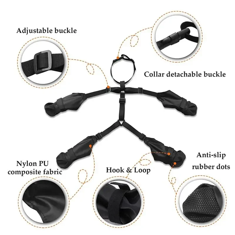 O suspensório distribui o peso e mantém o ajuste estável, permitindo que o cão caminhe com mais naturalidade, sem interrupções constantes durante o passeio.
